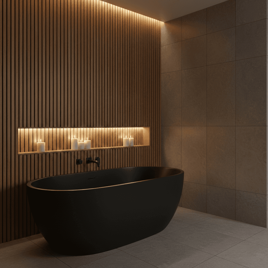 The Warmth: The wood-slat textures and warm candle-lit niches provide the "human" element that makes a modern city apartment feel like a home.