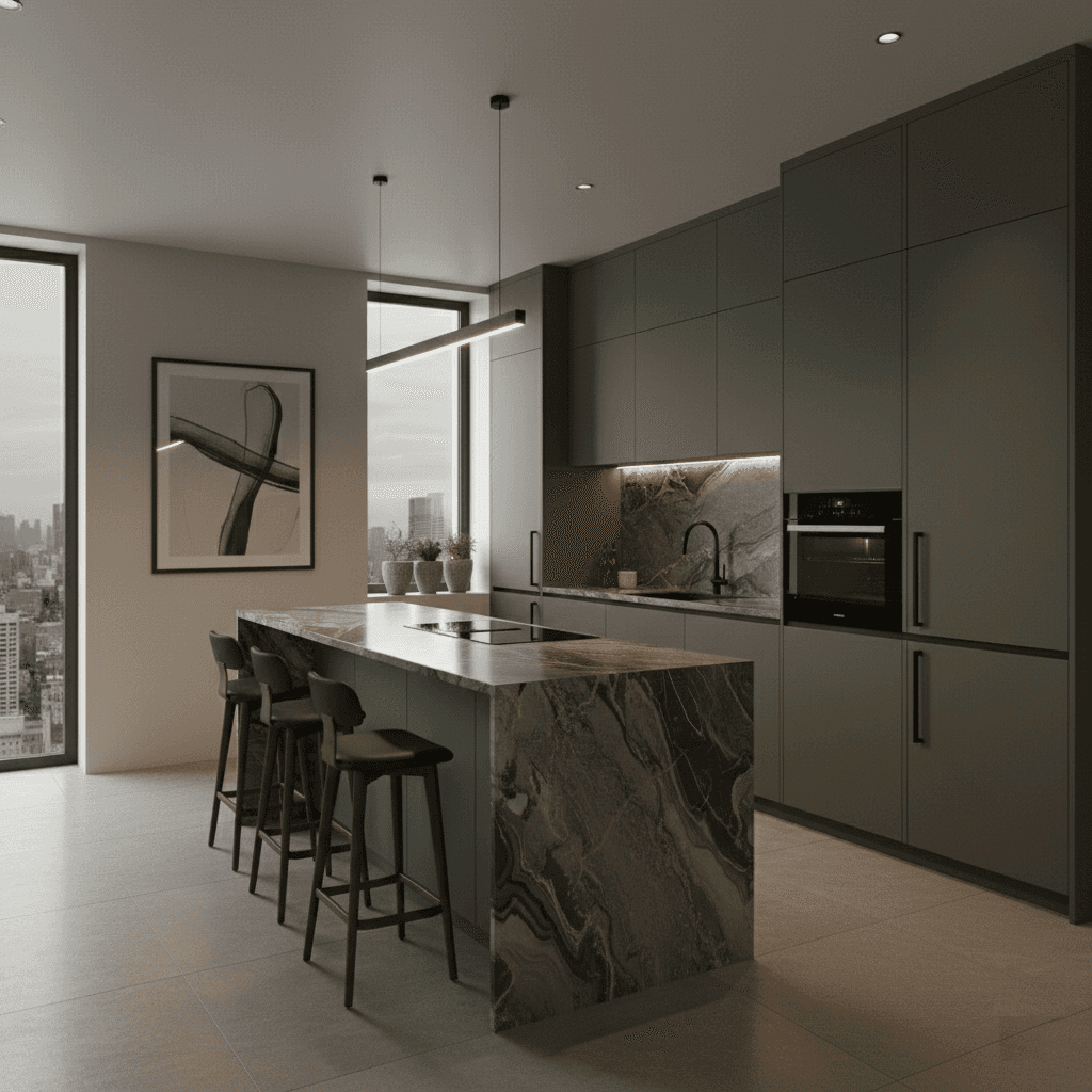 Handleless Design: The flat-panel cabinets and integrated appliances keep the focus on the materials rather than the hardware.