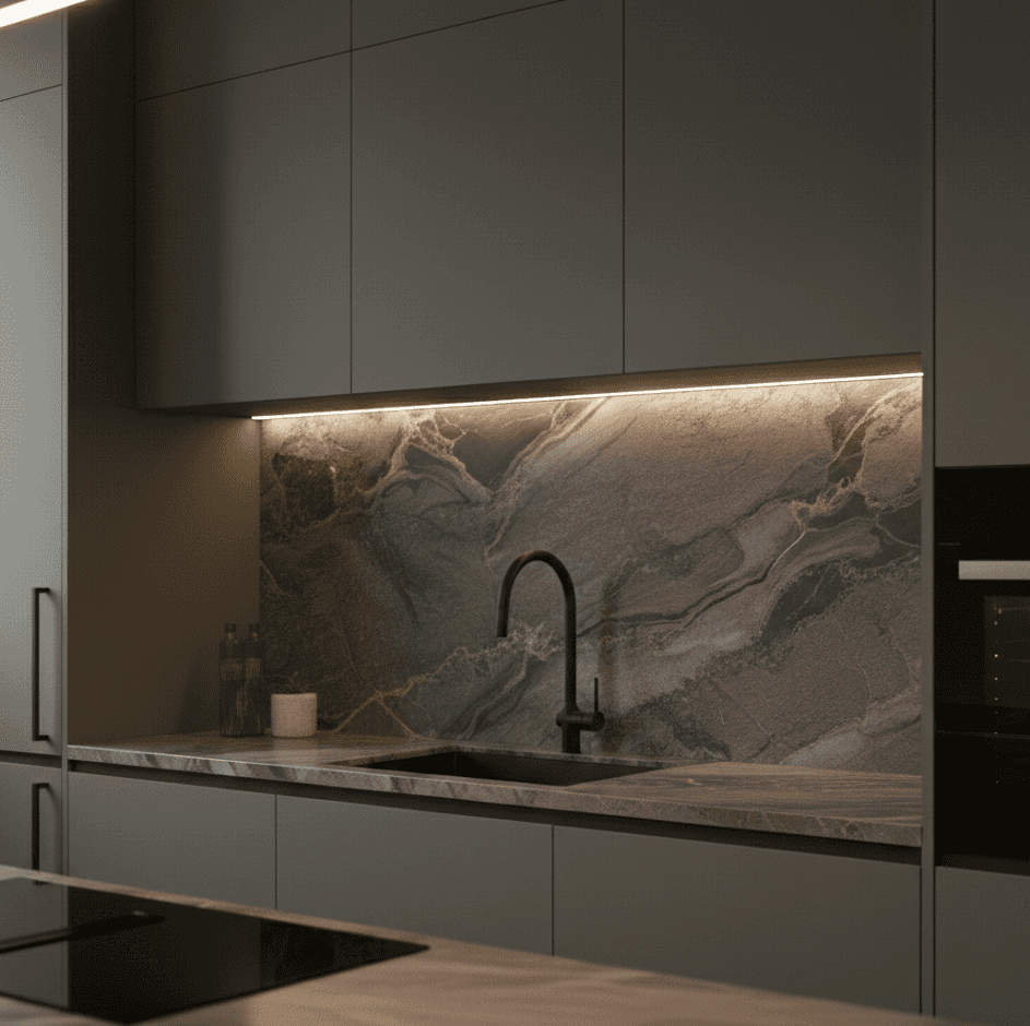 Reflective Texture: The use of the Cloe backsplash is intentional; its undulating surface catches the light differently throughout the day, adding movement to the kitchen.