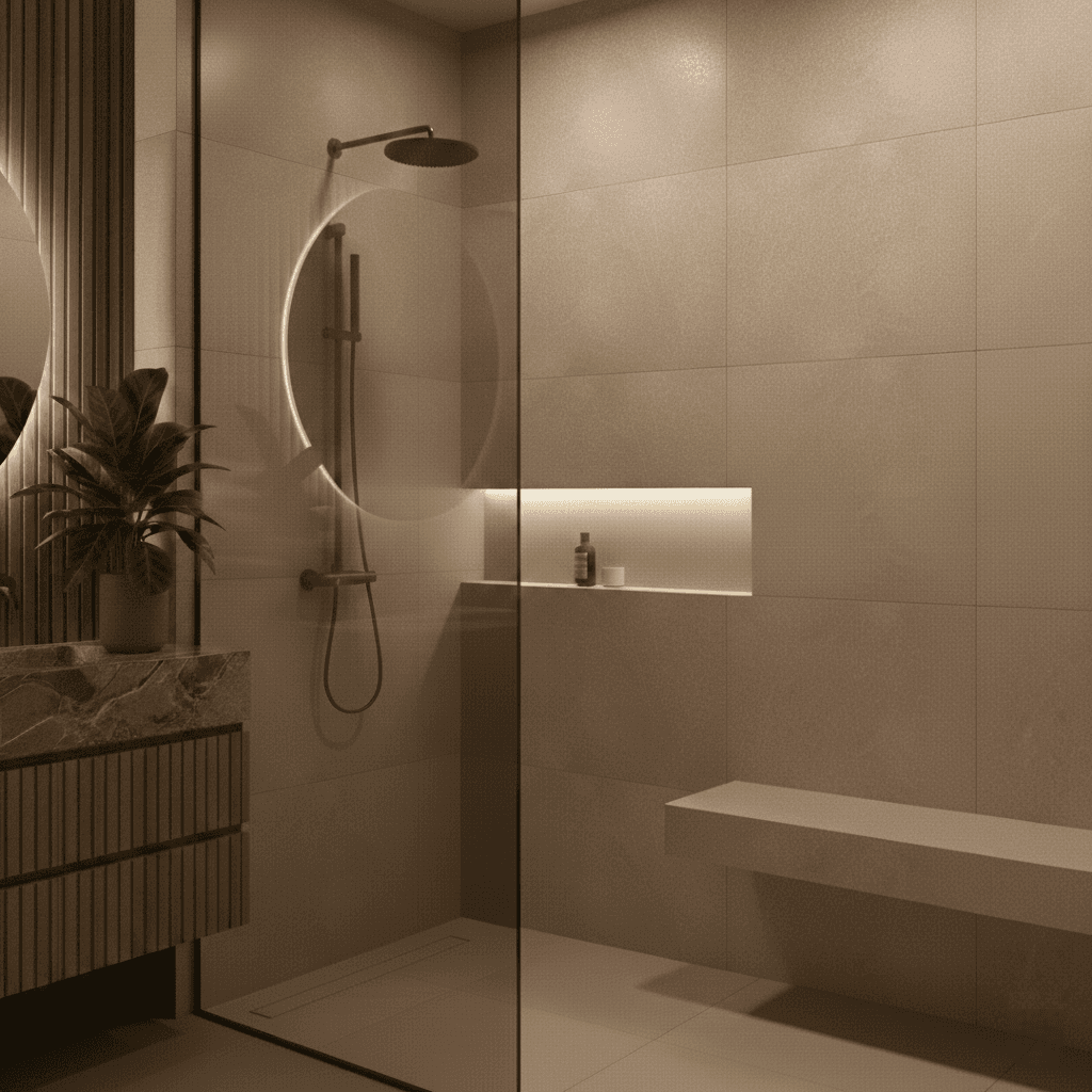 Large-Format Marble Porcelain: The shower walls use a 24x48 marble-look porcelain, which mimics the veining of the kitchen quartz but offers superior water resistance for wet areas.