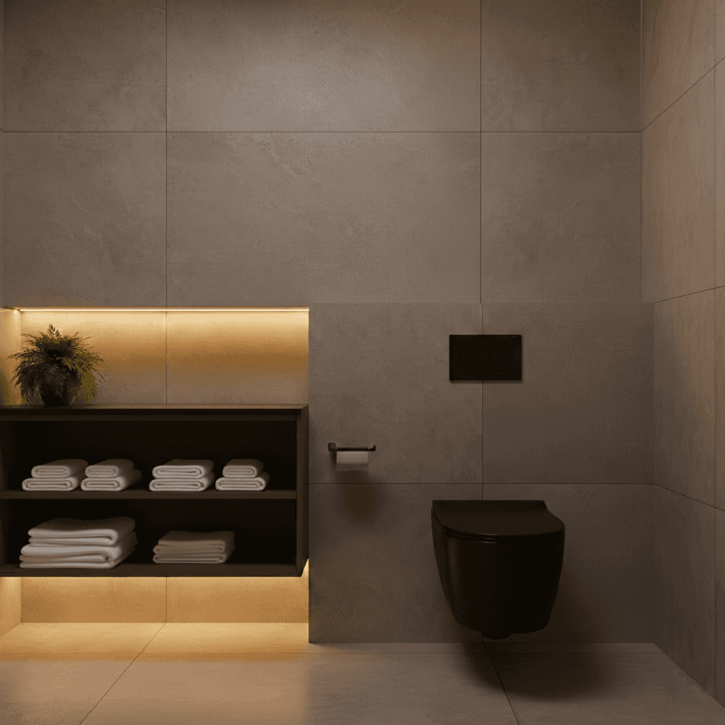 To maintain a modern, uncluttered look, the design features matte black hardware (faucets and flush plates) that disappears into the dark tilework. This "stealth luxury" approach ensures that the eye focuses on the architectural flow of the room rather than individual fixtures.