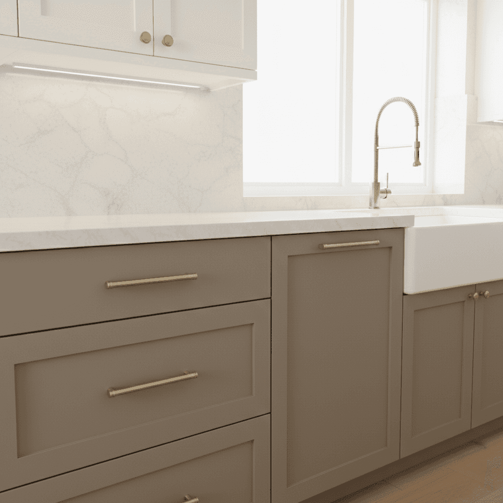 Cabinetry Modern shaker-style doors in a warm, matte taupe/mushroom finish.